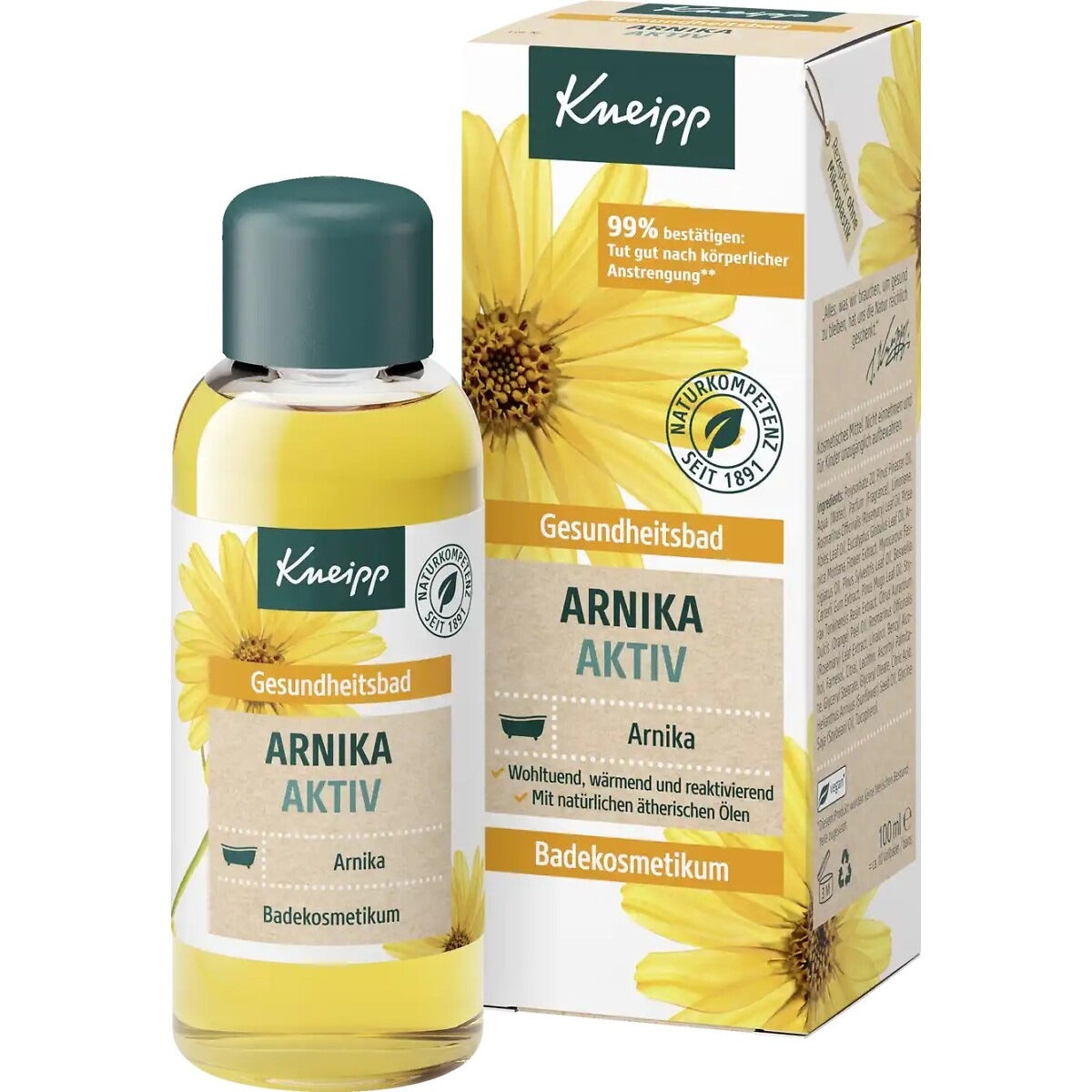 De weldadige, verwarmende en reactiverende Kneipp® Badolie Muscle Relaxation bevat een waardevol arnica-extract en natuurlijke etherische oliën uit cabreuva, rozemarijn en naaldbomen. In combinatie met de weldadige werking van het warme water ontwikkelt zich de natuurlijke geurwerking van de etherische oliën. **99% van de testpersonen bevestigen: Een bad met dit product verkwikt en doet goed na fysieke inspanning. (Gebruikersstudie, instemmingspercentage in %, 75 testpersonen).