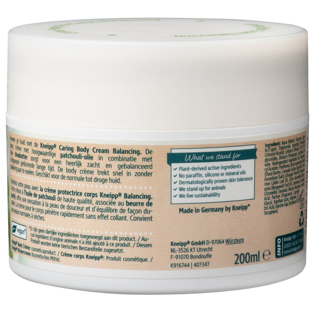 Ontspan en verzorg je huid met de hydraterende Kneipp Caring Body Creme Balancing. De bodycrème met hoogwaardige patchouli-olie in combinatie met de verzorgende sheabutter zorgt langdurig voor een heerlijk zachte huid. De crème trekt snel in zonder een plakkerig gevoel. Geschikt voor de normale huid.- Vegan