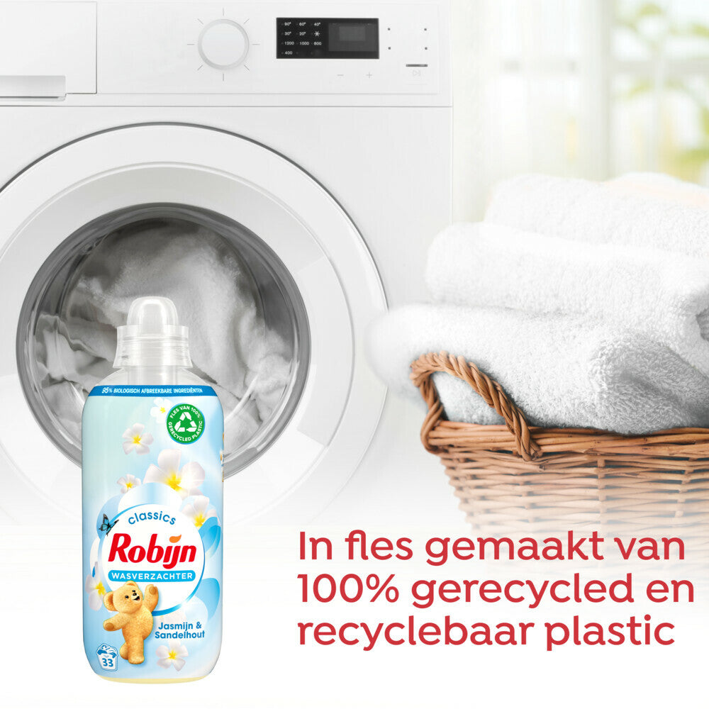 Robijn Classics Jasmijn & Sandelhout Wasverzachter voor heerlijk zacht wasgoed, nu met een verbeterde en nog intensere geur. De wasverzachter combineert de unieke geur van jasmijn en sandelhout met de zachtheid die je van Robijn wasverzachters kent. De wasverzachter zorgt ook voor een speciale beschermlaag rondom de vezels van de stof, waardoor er minder wrijving tussen de vezels ontstaat. Hierdoor slijt je kleding minder snel en worden pasvorm en kleuren behouden. Je kleding is ook makkelijker strijkbaar en droogt sneller. De ingrediënten van deze wasverzachter zijn voor 95% biologisch afbreekbaar* en de flessen zijn gemaakt van 100% gerecycled plastic en zijn 100% recyclebaar. Zo blijft je kleding heerlijk zacht en zorg je tegelijkertijd beter voor het milieu.Hoe te gebruiken