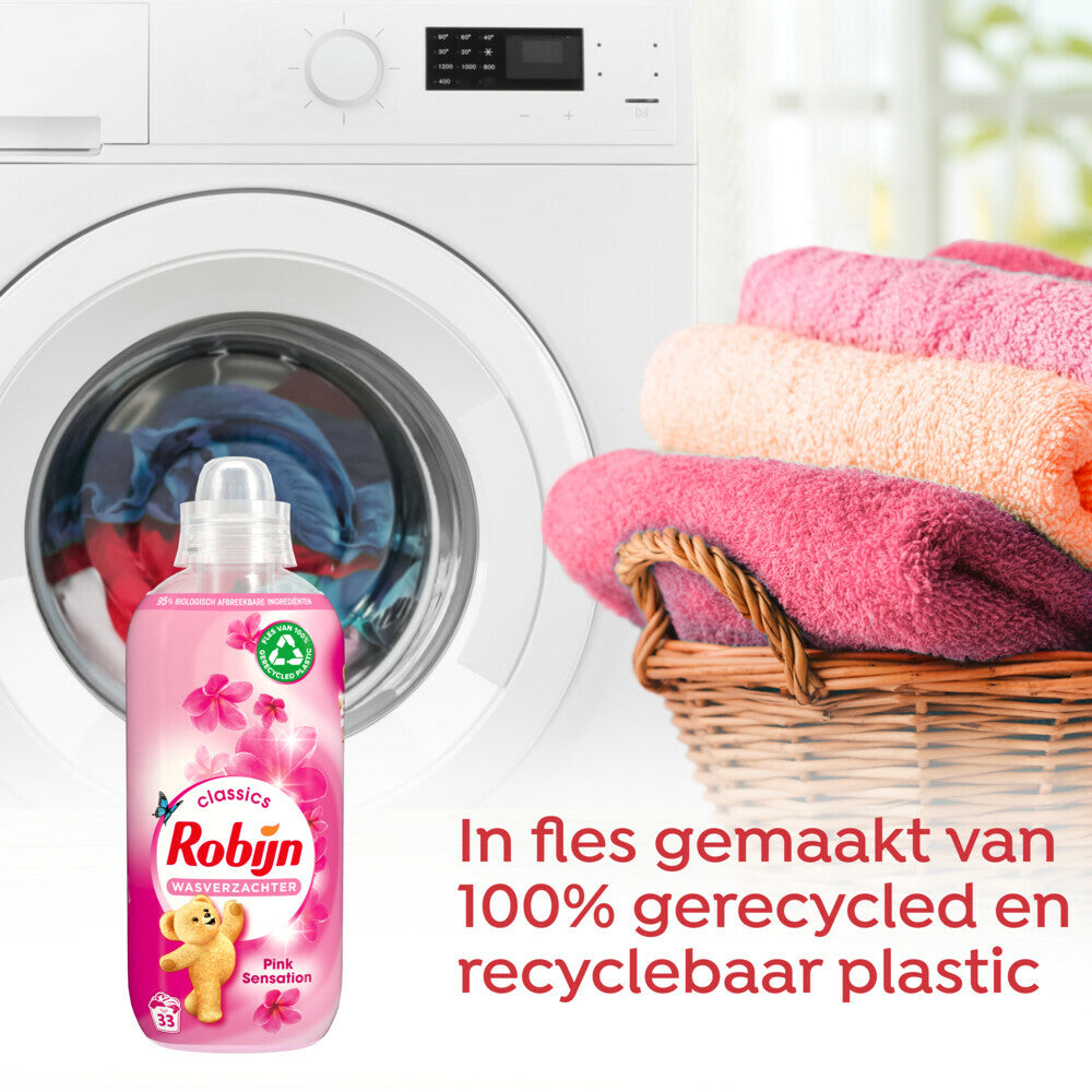 Robijn Classics Pink Sensation Wasverzachter met een intense frisse geur zorgt voor een zachte en frisse was, met 95% biologisch afbreekbare ingrediënten.- Robijn Classics Pink Sensation Wasverzachter voor langdurige geursensatie