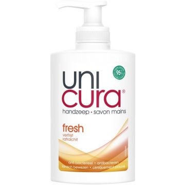 De klinisch bewezen Unicura Fris Handzeep is speciaal ontwikkeld om elke dag te zorgen voor schone handen, terwijl het de huid ook zacht en soepel maakt. De formule met een antibacterieel ingrediënt beschermt je handen effectief tegen elke vorm van bacteriën die je tegenkomt tijdens je dagelijkse bezigheden. De handzeep is verrijkt met een hydraterend bestanddeel zodat je handen gevoed en gehydrateerd blijven.Unicura Fresh Handzeep is ontwikkeld om ieder huidtype effectief te reinigen en goed te hydrateren. De formule zorgt dagelijks voor een fris gevoel en goede verzorging zodat je je handen goed beschermd houdt tegen bacteriën. Daarnaast heeft het een fijne geur zodat je handen langdurig lekker ruiken.- Antibacteriële handzeep
